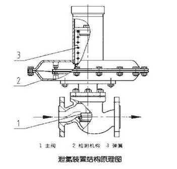 供氮装置结构如右图所示,将设在罐顶的取压点的介质经导压管引入检测机构(7)、介质在检测元件上产生一个作用力与弹簧(8)、预紧力相平衡。当罐内压力降低至低于供氮装置压力设定点时,平衡被破坏,使指挥器阀芯(6)打开,从而使阀前气体经减压阀(5)、节流阀(4)、进入主阀执行机构(3)上、下膜室,打主开阀阀芯(2)、向罐内充注氮气;当罐内压力升至供氮装置压力设定点时,由于预设弹簧力,关闭指挥器阀芯(6)又由于主阀执行机构中弹簧作用,关闭主阀,停止供氮。